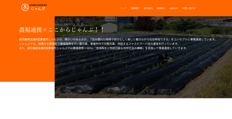 イメージカラーであるオレンジを全体に配置し、インパクトを与えるとともに、どんな事業所か見るだけで分かるよう工夫しました。HPを作成したことで「楽しそうな事業所なので見学へ行かせてください」などの問い合わせが増え、ご利用者獲得につながっています。